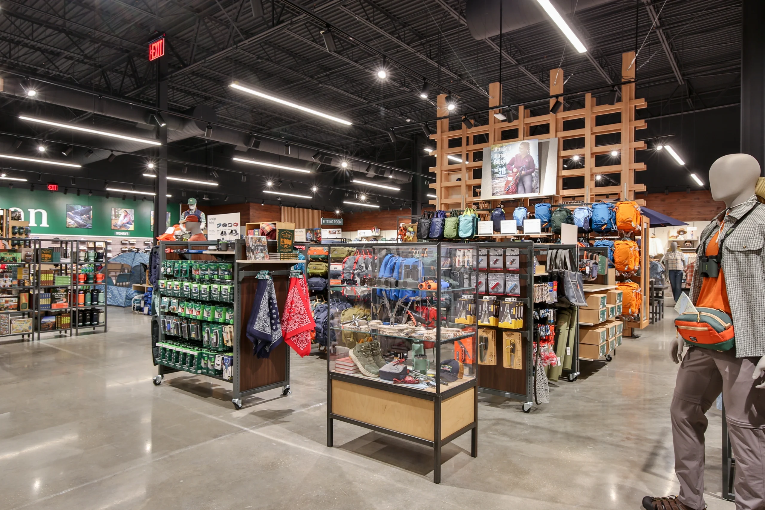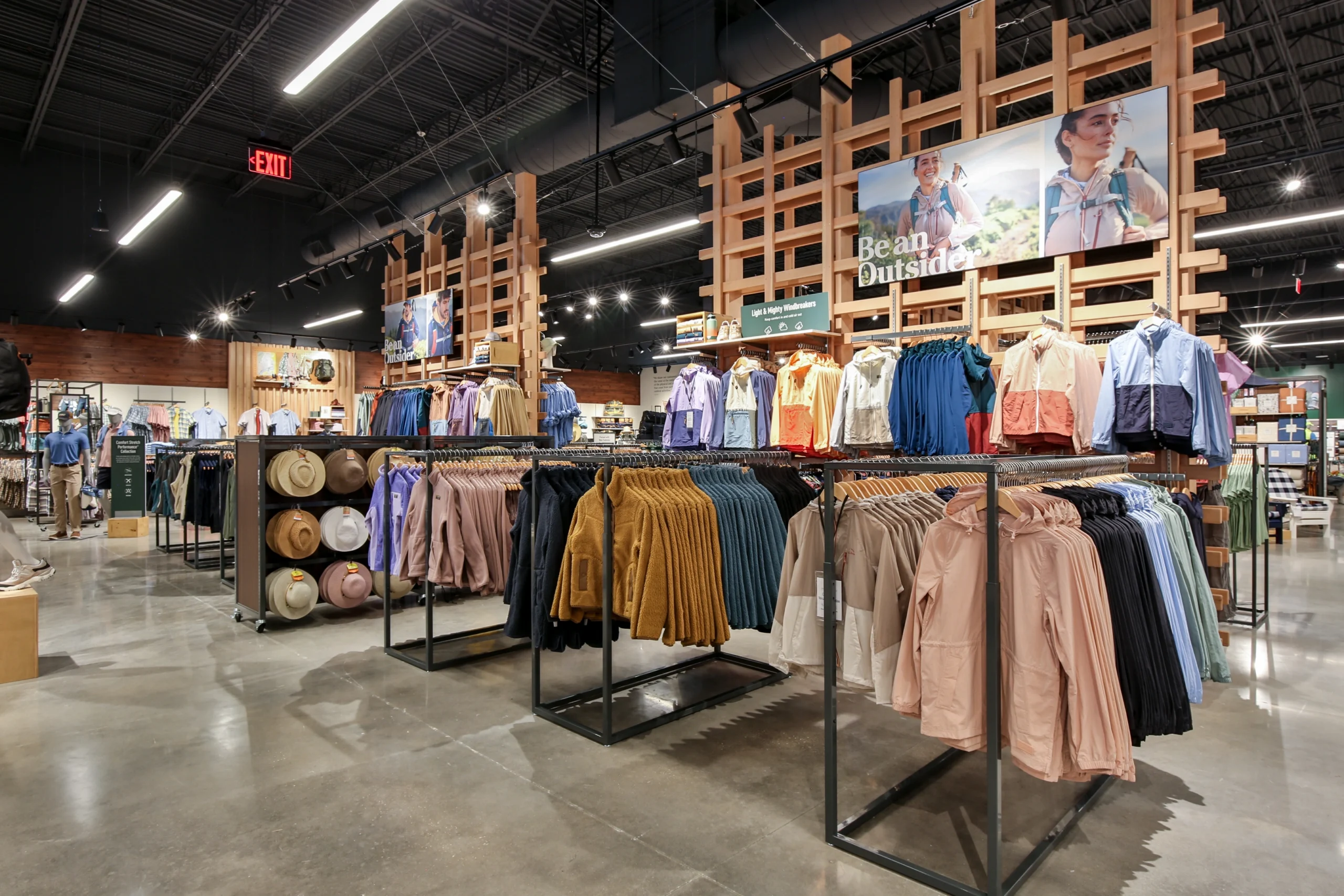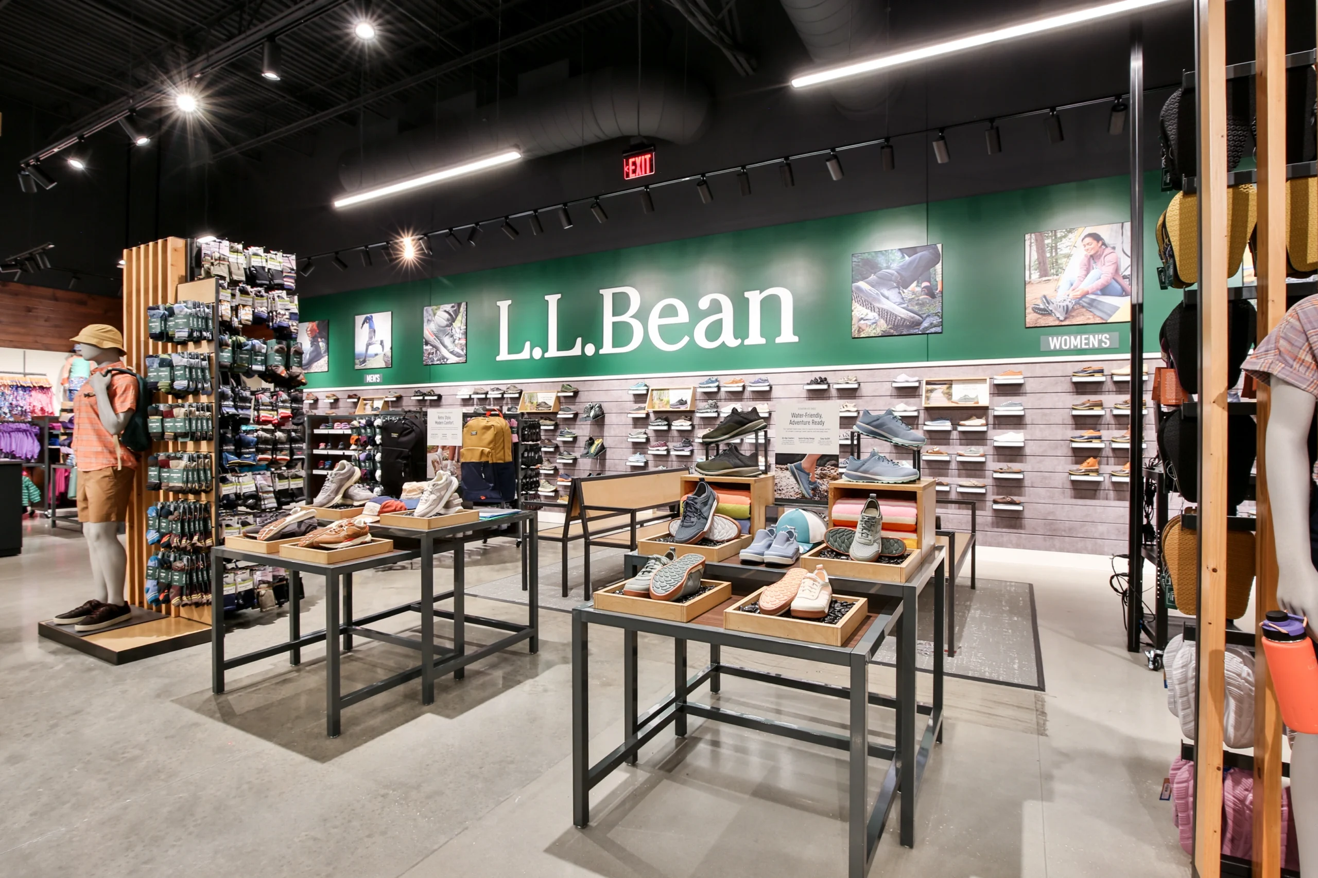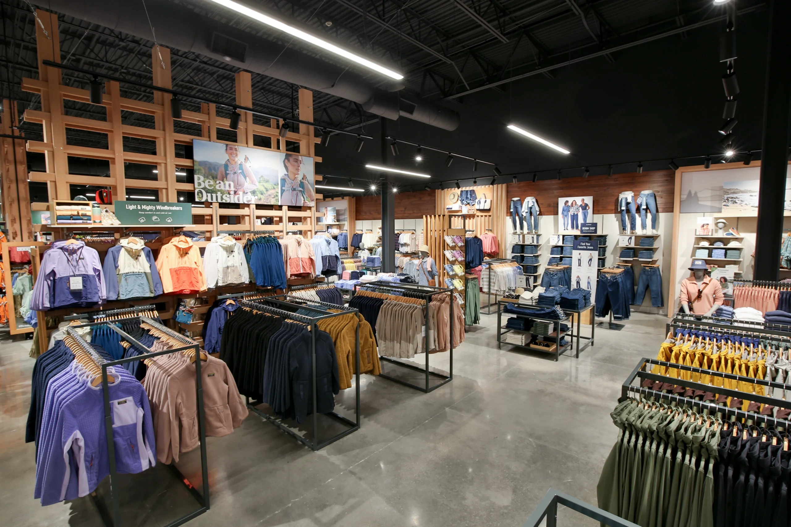 The project required a comprehensive interior fit-out, including selective demolition, new partitions and ceilings, specialty lighting, finishes, custom millwork, and installation of L.L.Bean’s proprietary fixture and merchandising systems. Exterior work introduced branded façade signage and signature kayak display elements, reinforcing the retailer’s outdoor identity within a high-profile shopping destination.