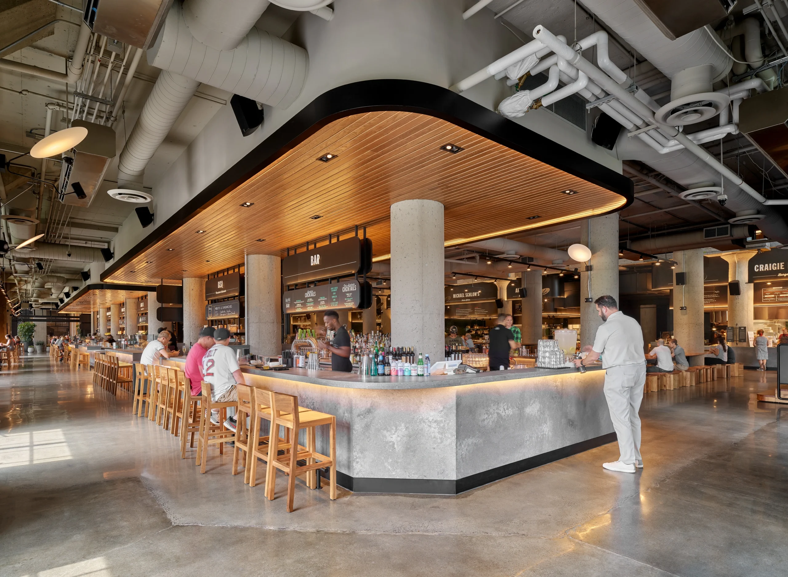 Designed to house 15 independent kitchen concepts, two full-service bars, a cooking academy, retail, and flexible communal seating, the space required thoughtful coordination and robust infrastructure to support high-volume culinary operations. The result is a high-energy hospitality destination that anchors the neighborhood and brings Boston’s food and culture together under one roof.